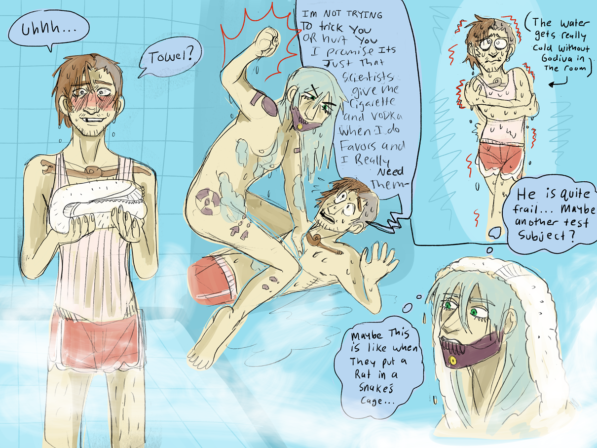 Within the steam, Nikita can tell she's a bit taller than he is, with thicker arms and some markings on her shoulders and legs. She must be really fit, really lean. A total babe. She has longer hair too, which she's washing and combing her fingers through. Soap clings to her body, covering just enough...