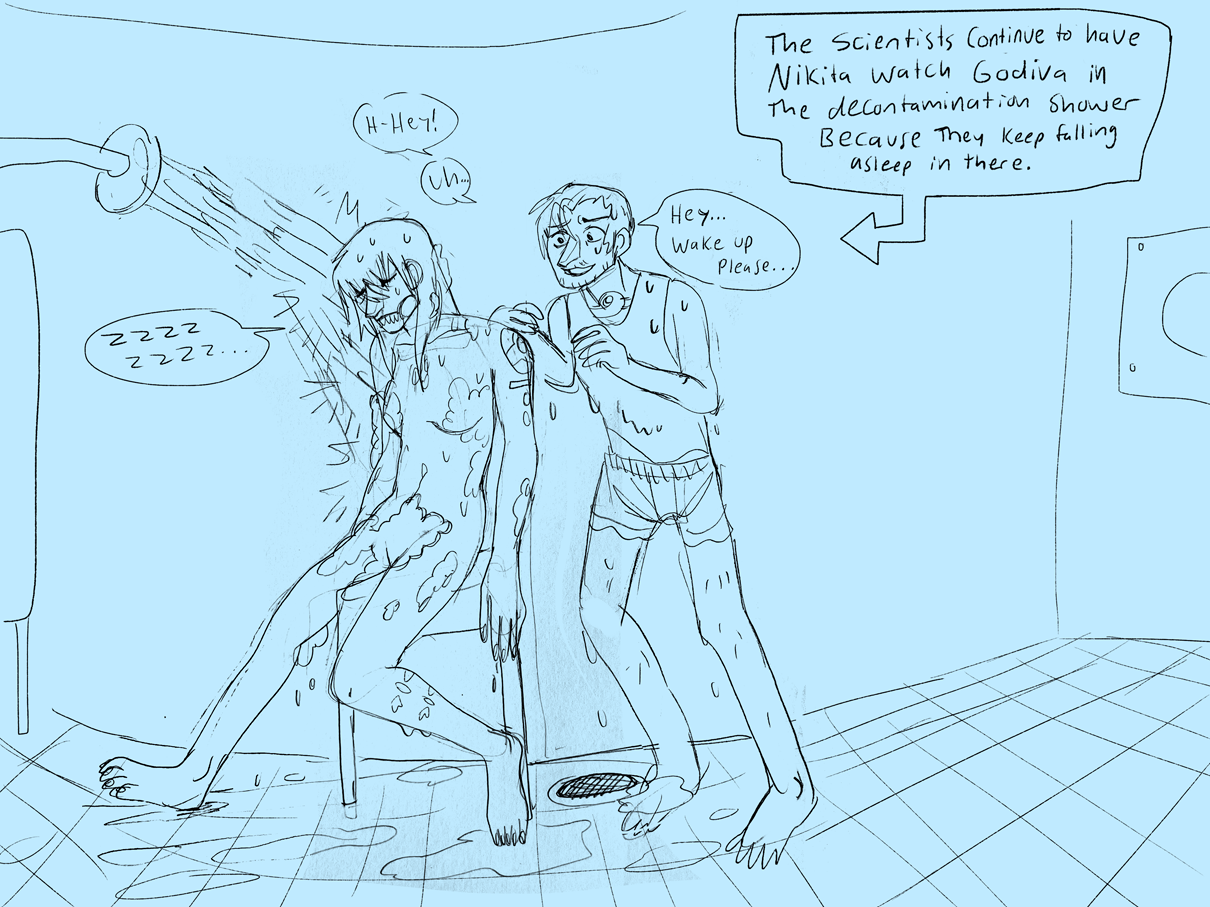 Something inside them snaps, and they pin Nikita against the shower wall. His little yellow machine is clicking rapidly at this point. Their hands are scalding hot to the touch, like the blood under their skin was boiling. They bare sharp, metal teeth. Nikita shrieks.